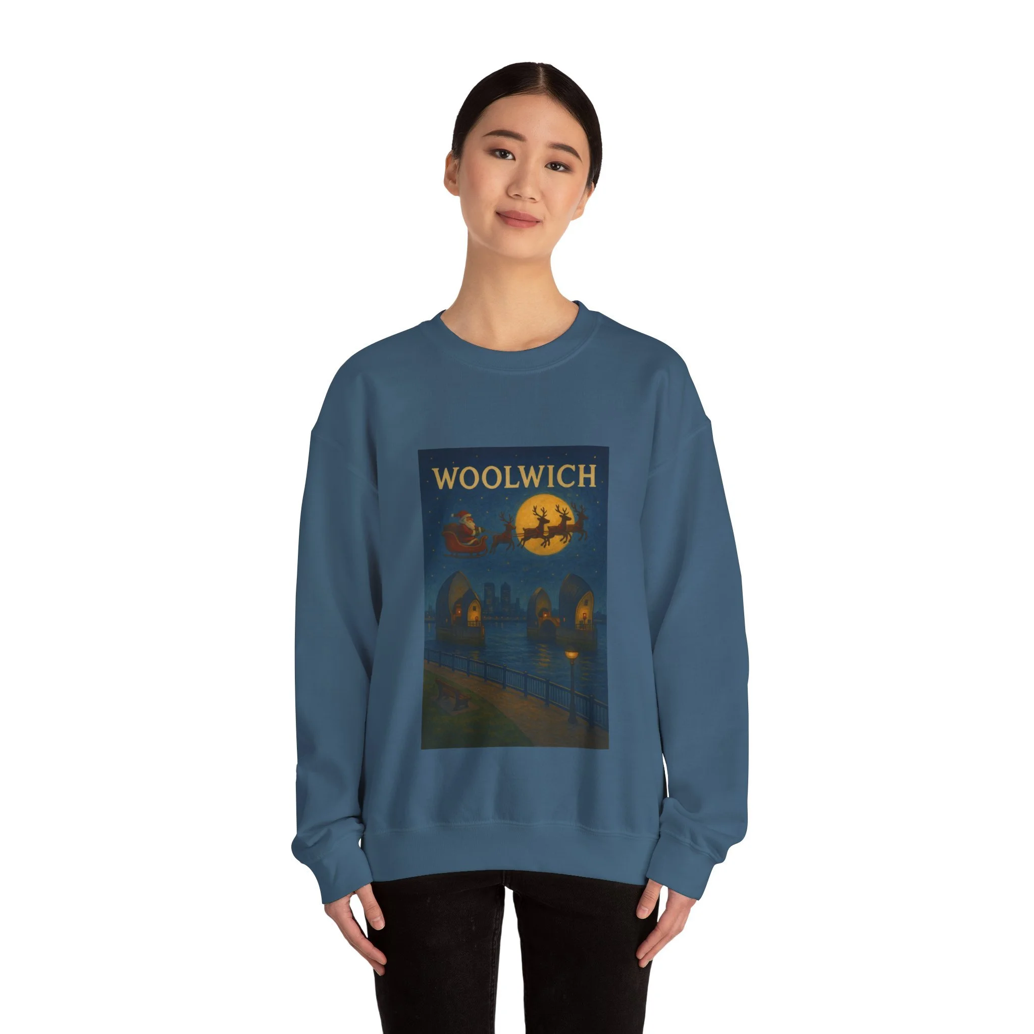 On the night before Christmas in Woolwich, Santa soars over the glowing Thames Barrier, lighting up the river with festive magic. This cosy jumper celebrates the warmth of Woolwich’s riverside community – where neighbours, lights and laughter make it feel like home.